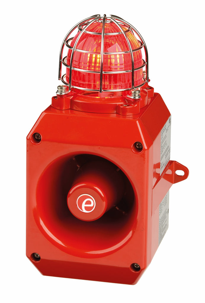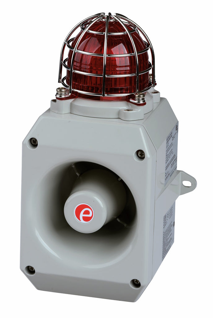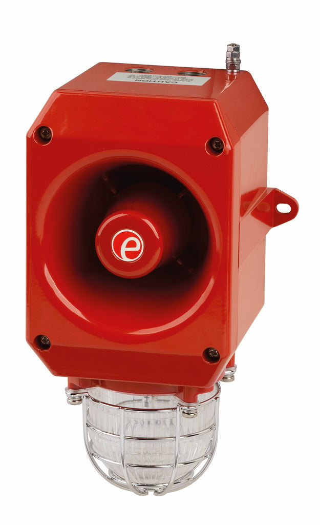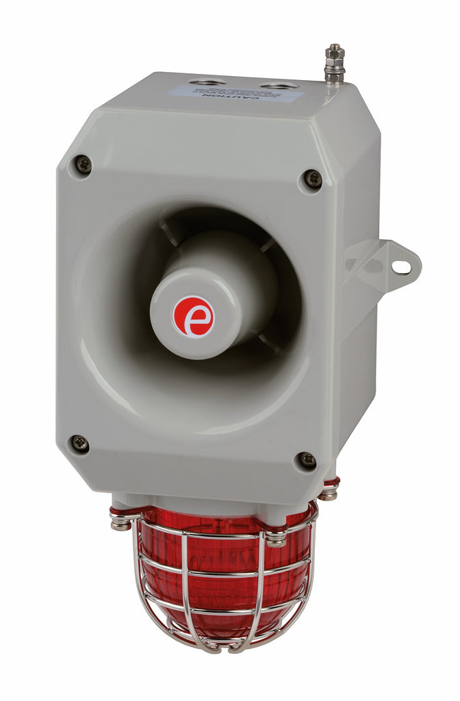 The D2xC1X05 and D2xC1X10 are high-output, combination audible-visual signaling devices designed for hazardous location fire alarm and general signaling applications. Each unit integrates a 107 dB(A) alarm horn with a Xenon strobe, available in either 5 Joule (D2xC1X05) or 10 Joule (D2xC1X10) configurations to meet varying visual intensity requirements.